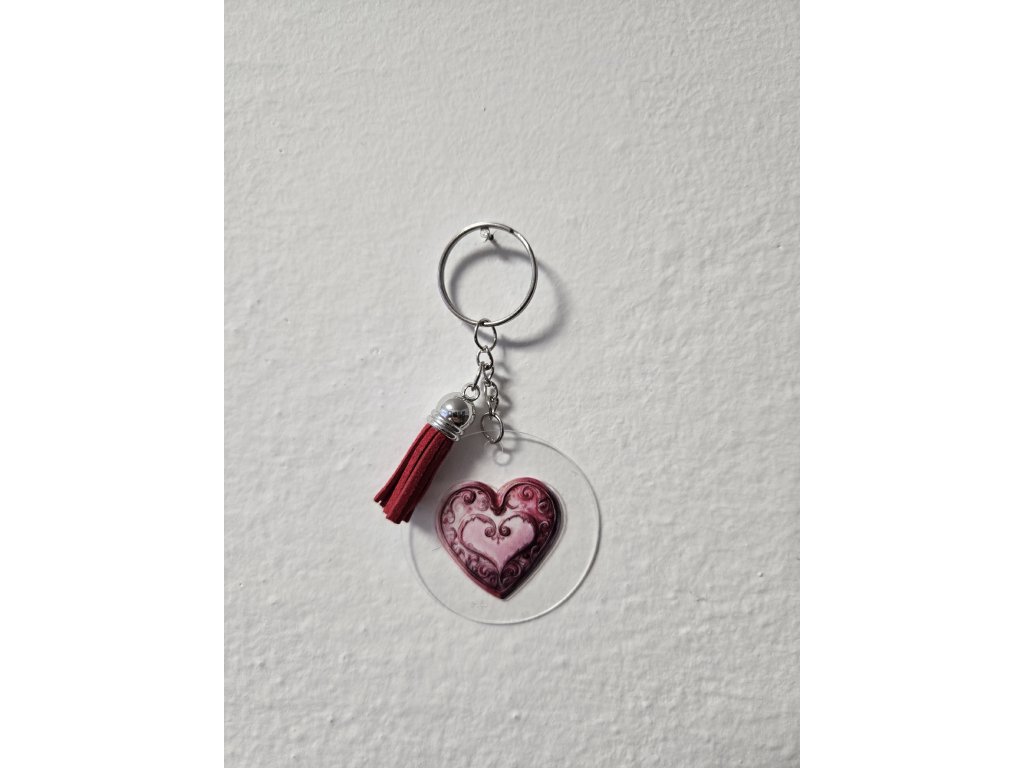 Originální klíčenka s jemným motivem, doplněná ozdobným střapcem.
