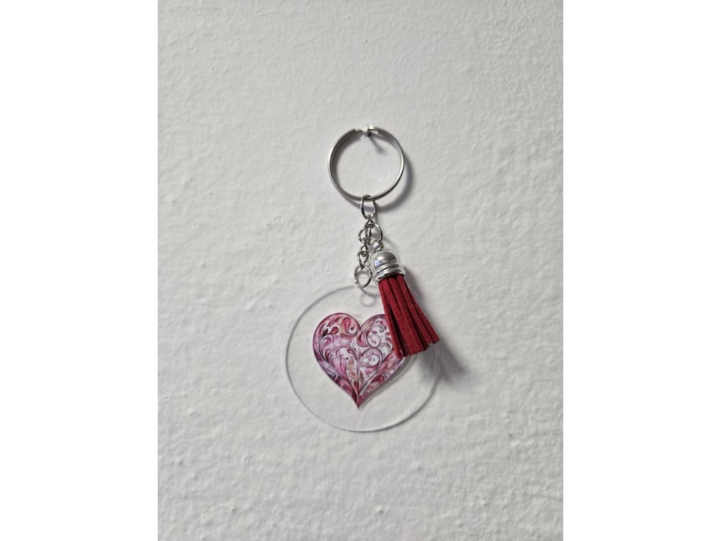 Originální klíčenka s jemným motivem, doplněná ozdobným střapcem,