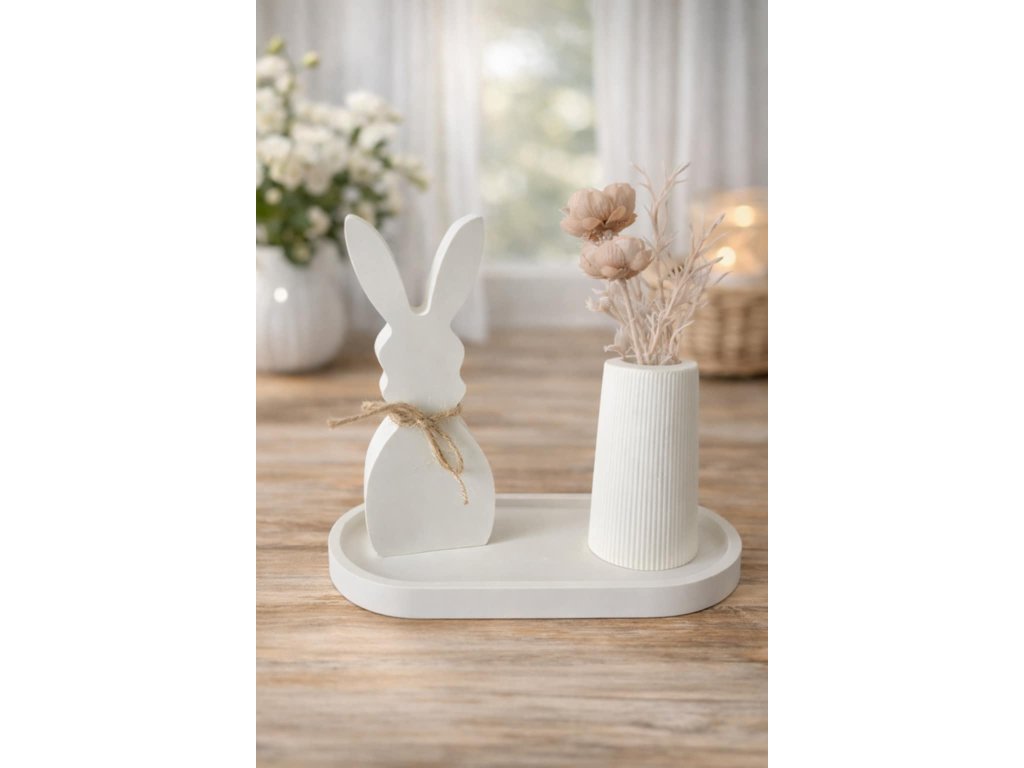 Sada obsahuje roztomilého zajíčka ozdobeného jutovým provázkem a elegantní rýhovanou vázičku, vše umístěno na designovém podnose.